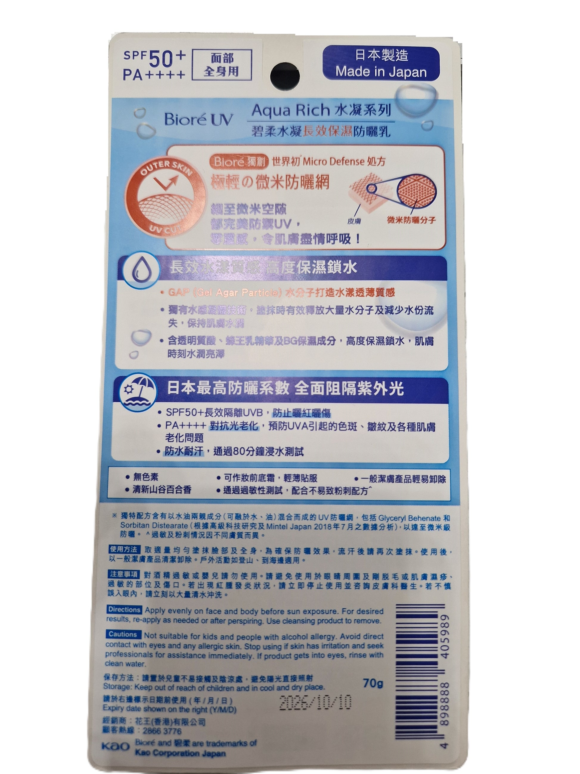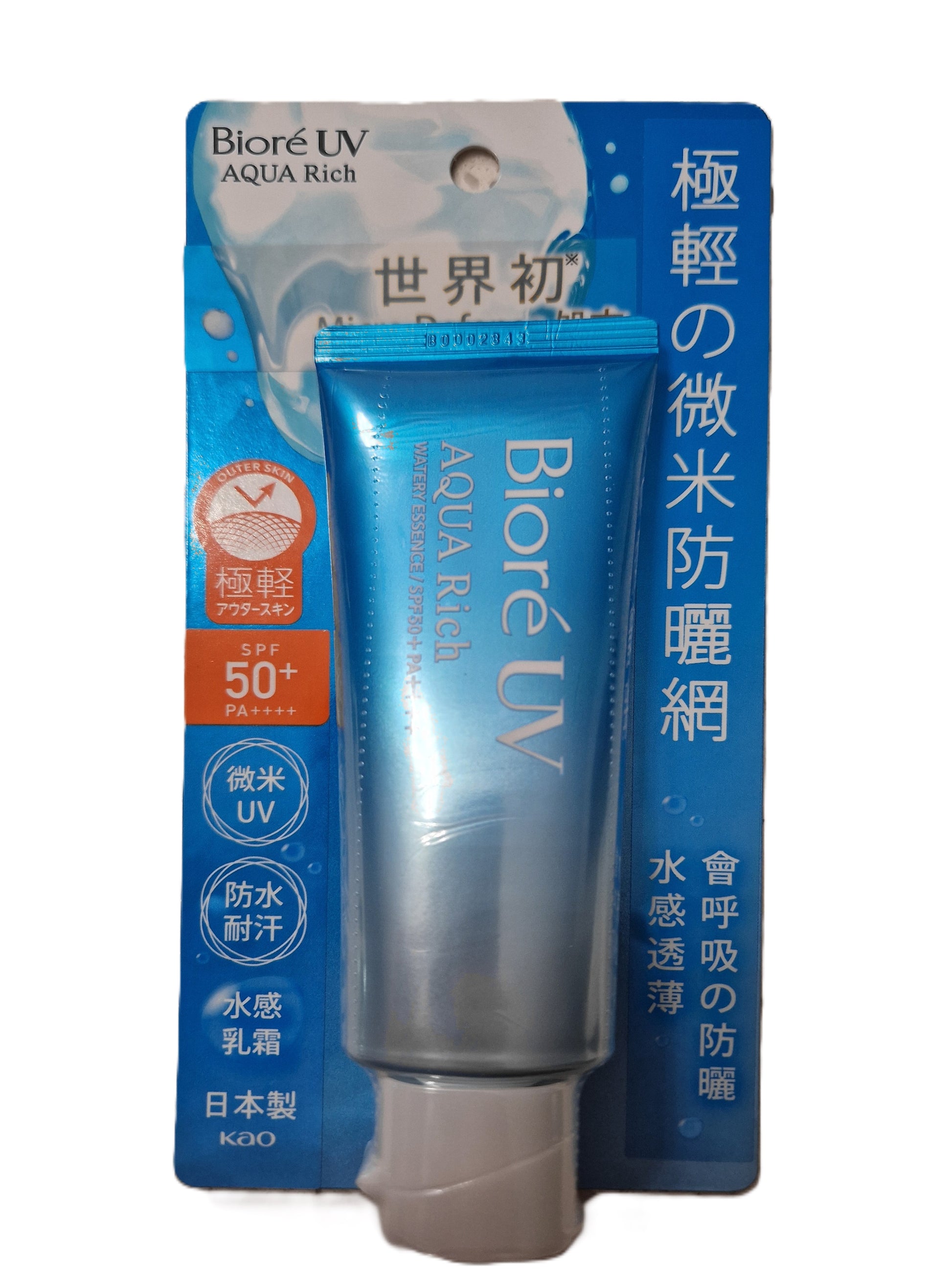 BIORE UV Aqua Rich Watery Essence / SPF50+ PA++++ is developed from Bioré Japan’s water-based sunscreens, iconic for their fresh textures and invisible clean protection. With SPF 50 UVA & UVB, this feather-light watery essence with sunscreen spreads easily and absorbs instantly to hydrate and helps protect from UV rays.